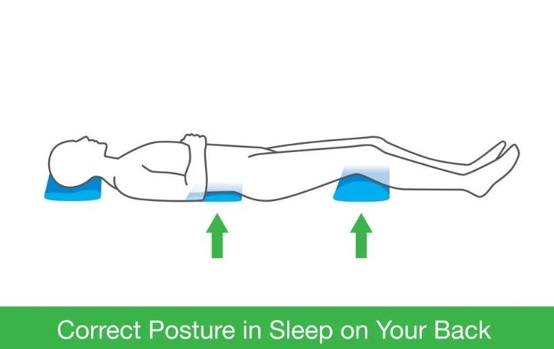 仰卧时很多人可能出现腰和床的空隙过大,导致腰部无法放松的情况。建议可以在大腿或膝关节下放置一个枕头,让下肢微微屈髋屈膝,这样腰椎就可以更加放松地轻贴床面,帮助腰背放松。